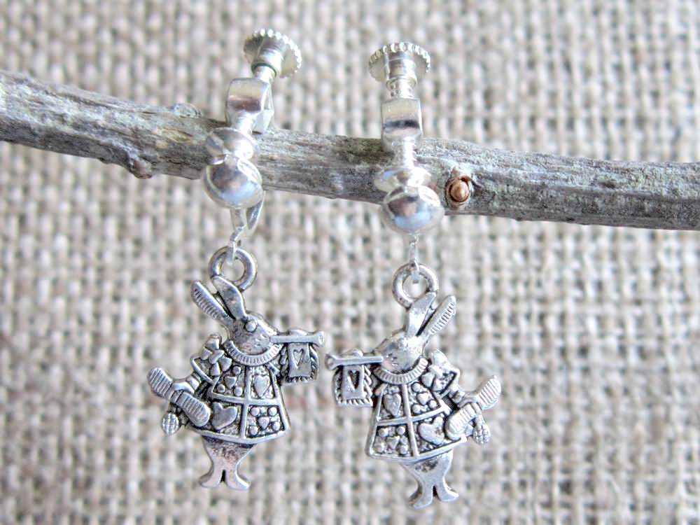 These earrings comprise a pair of silver-plated White Rabbits in heraldic costume (approximately 20 x 13mm) suspended from silver-plated clip-on fittings.