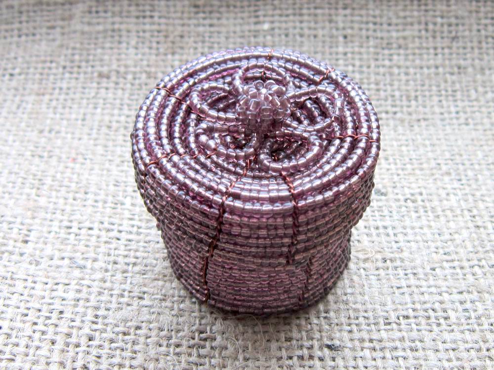 This round beaded wirework box comes with a beaded flower on the lid, and is approximately 55 x 50 x 50mm. Not suitable for children.