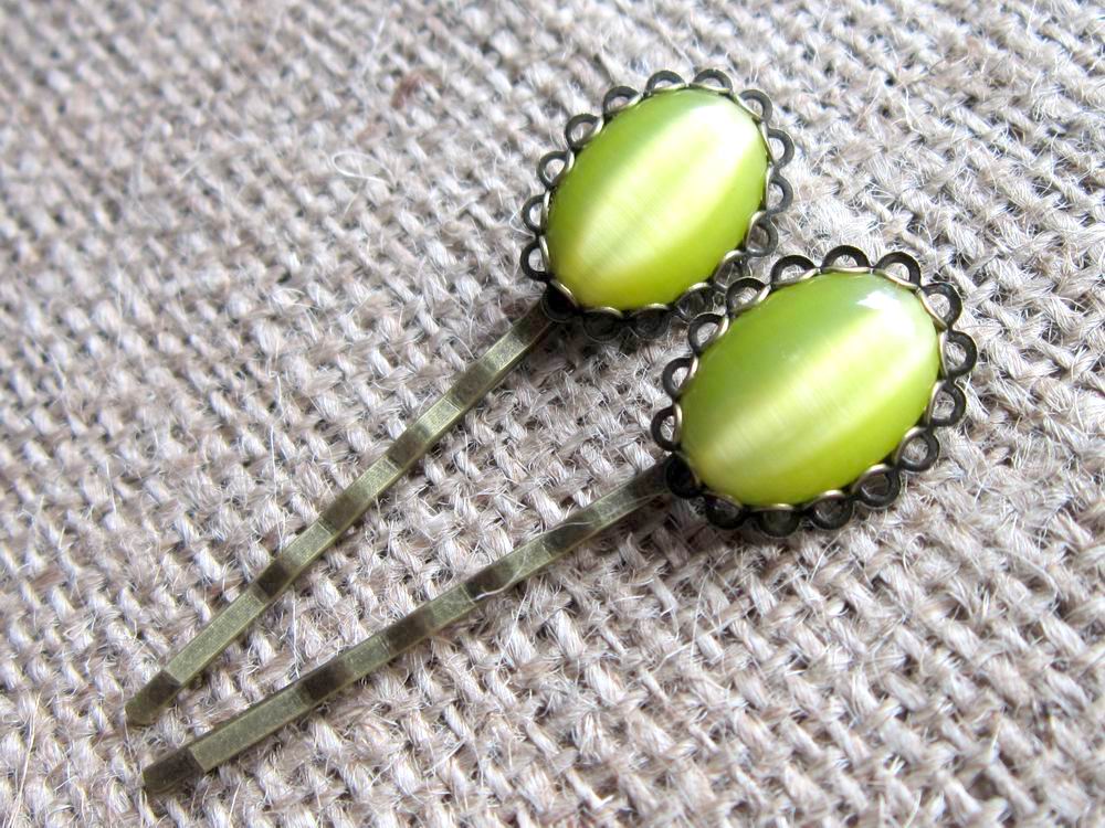 A pair of bronze hair grips, inset with refractive yellow cat’s eye glass cabochons.
